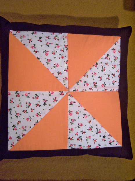 Oranžovo-kytičkový polštář o velikosti 40 x 40 cm.