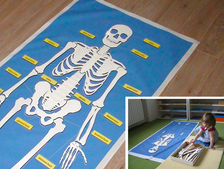 Dřevěné puzzle lidské kostry díky kterému se děti naučí rozpoznat a pojmenovat kosti v lidském těle. Výška kostry je cca 155 cm a skládá se na látku s předtištěnými obrysy. Ke kostře se přiřazuje 23 destiček s názvy jednotlivých kostí. Tato pomůcka je vyrobena v souladu s principy Montessori pedagogiky.