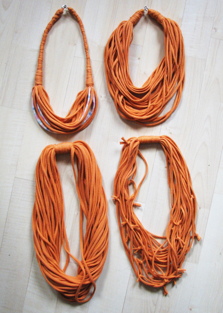 Čtyři náhrdelníky vzniklé z jednoho nepotřebného trika