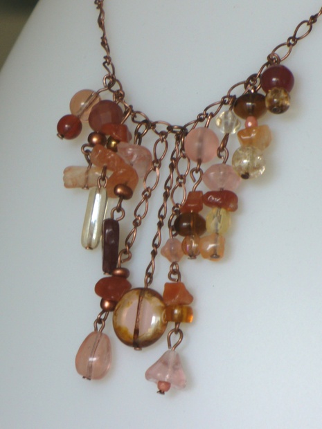 (50 cm) ketlované skleněné jablonecké korálky a zlomky polodrahokamů (karneol, křišťál), řetízek a zapínání barvy mědi