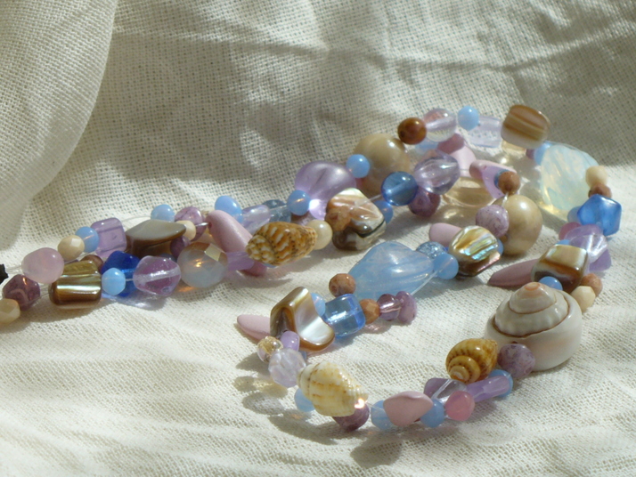 jemné pastelové barvy s dominující lila fialovou - soulad jemnosti a nevysvětlitelné nepřehlédnutelnosti, dokonalých přírodních i rafinovaně prostých skleněných tvarů, perleťový lesk, třpyt broušených korálků, vnitřní světýlko opalitů