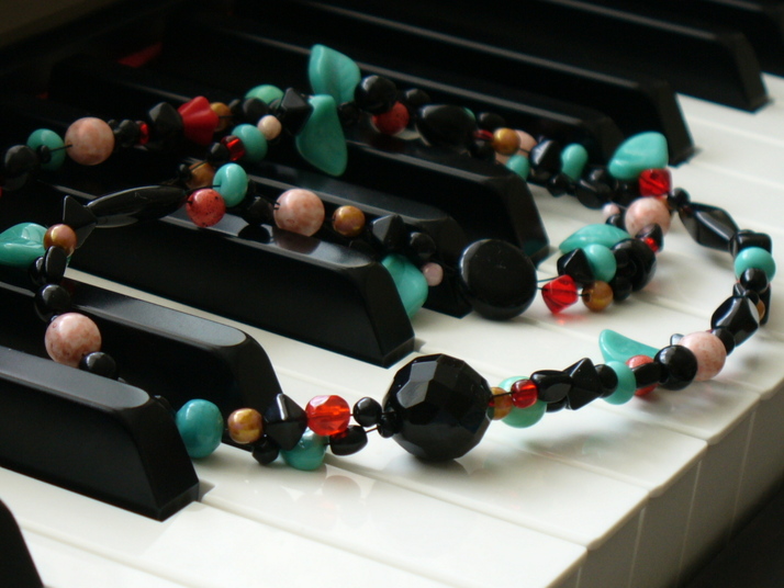 skleněné jablonecké korálky na dvou černých lankách (63 cm)