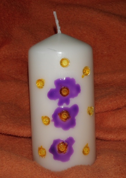 Eliška odchází ze školky a už z ní bude školačka, takže vyrábí dárečky pro svoje paní učitelky. Svíčka zdobená technikou barviček na sklo a různých korálků a drahokamů.