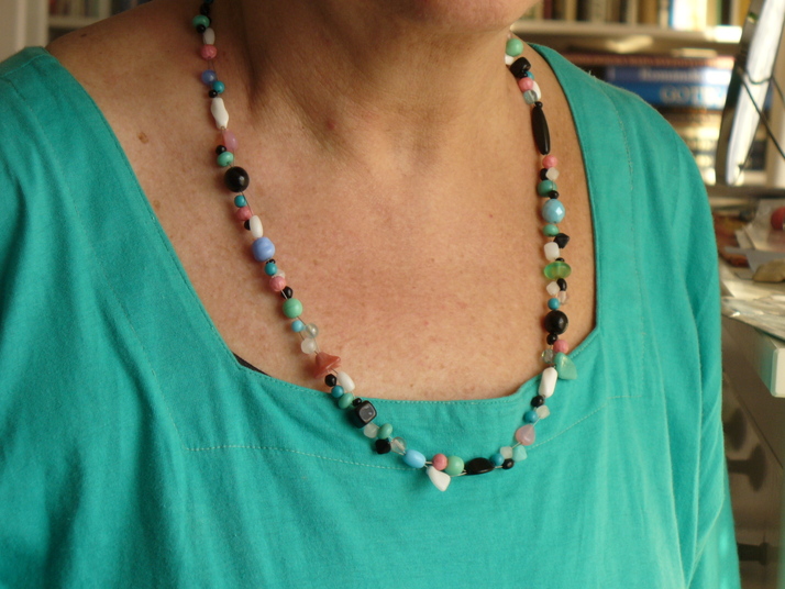 na černých lankách se proplétají černé, bílé, modré, zelené, růžové jablonecké skleněné korálky, vesele swingují a udrží v rytmu i nositelku