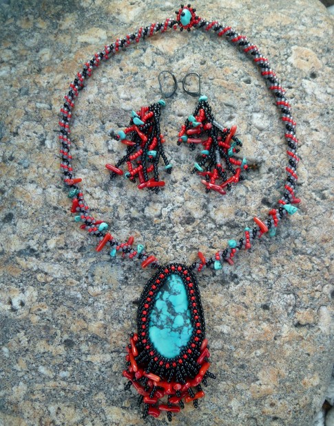 Pravý tyrkys obšitý na plsti rokajlem Matsuno a Preciosa, zlomky tyrkysu a větvičkami korálu - spiral rope a náušničky šité korálovou technikou