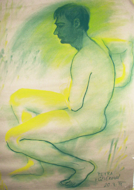 Kresba žlutým a zeleným pastelem na balícím papíře. Formát cca 100x70cm