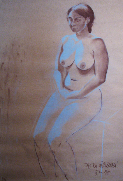 Kresba hnědým a modrým pastelem na balícím papíře. Formát cca 100x70cm