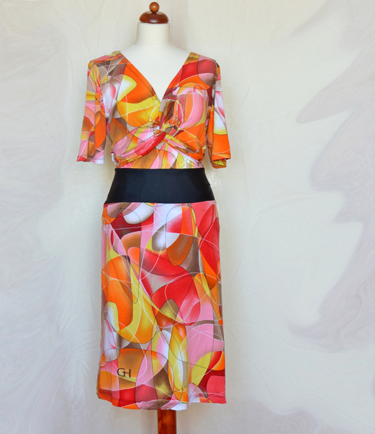 Poprvé jsem v obchodě ulítla na hodně barevnou a výraznou látku. Není to můj styl, ale líbila se mi. K tričku musím podotknout, že sluší i prostorově výraznějším ženám, mám to vyzkoušené, šila jsem ho i pro vel. 52