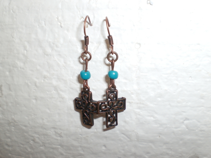 Malé náušnice ve tvaru křížku, doplněné tyrkysovým korálkem. Cena: 35Kč