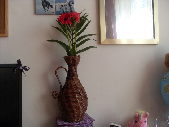 upletena z papiroveho pedicu ve vnitr je flaska aby vni mohli bejt zive kvetiny je nalakovana lakem