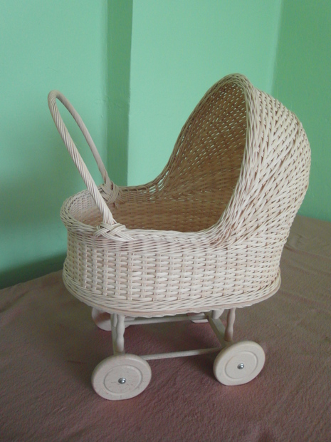 Kočárek z pedigu s dřevěným podvozkem. Celková výška 60cm. Korbička 54x31cm.