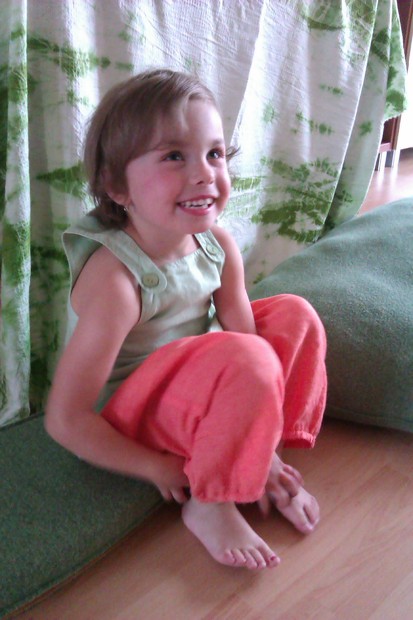 Moje drobátko Alexia v lněném kompletu OSKA s vlastnoručne dělanou batikou,kterou dělám výlučně z přírodnich materialů, v různych barvách a kombinací.Barvím oděvy i také metráž.