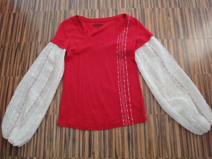 Měla jsem doma červené triko a nevěděla co s ním, tak jsem zaexperimentovala a přišila na něj rukávy z průhledné látky a ještě jsem triko pokreslila a rukávy trošku vyšila, co vy na to? :o))) Mě se líbí. :o)))