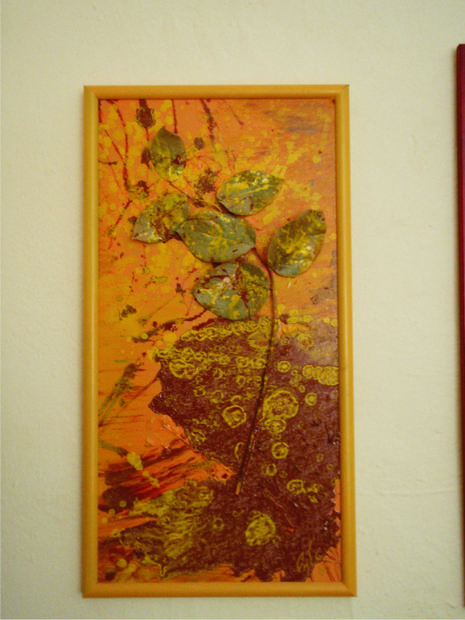 Koláž suchého lístí a trávy podzimních barev a nálad.