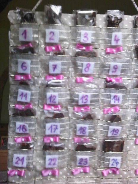 Možná někoho inspirujeme.Kalendář jsem šila Ladušce,protože v těch kupovaných jsou moc malé čokolády.A naplnily jsme si ho vlastnoručně doma vyráběnými čokoládičkami.Vyráběly jsme hořké i mléčné s rozinkami,oříšky a kandovaným ovocem