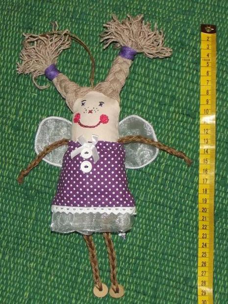 Moje první Andělka - ta fialová, co mám na profil fotce - vznikla úplně náhodou. Letos na jaře jsem koketovala s in-line bruslema, přivodila jsem si zhmoždění vnitřního svalstva dutiny břišní a dosud chodím na rehabilitaci. No a právě tam jsem ji potkala - Andulku... Nejdříve jsem ji neviděla, páč jsem byla za plentou, takže jsem jen slyšela dětský hlásek, holčičku co lezla po žebřiku na půdu za koťátky. Spadla, noženku si polámala a doktoři jí ji zdrátovali, sešroubovali. A tak chodí rehabilitovat, statečná je, jen sem tam kňourala bolestí. A pak jsme ji uviděla - malé žlutovlasé střapaté stvoření, působila na mne jak malinká víla z rozverné pohádky... Pochválila jsem ji, jak je šikovná a slíbila, že jí příště přinesu nějaký dáreček, když tak statečně cvičí.... A tak se mi v hlavě narodila Andělka pro Andulku...