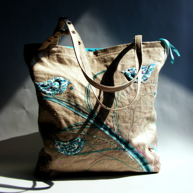 kabelka z pevného lnu s autorskou výšivkou a aplikací.