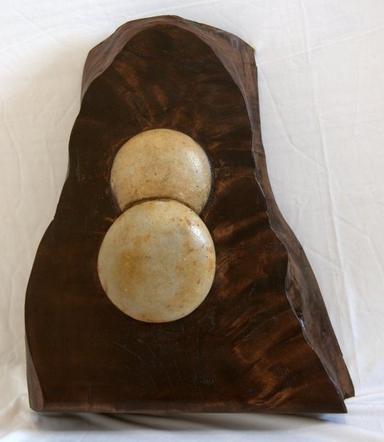 nalezené kameny zasazené do dřeva