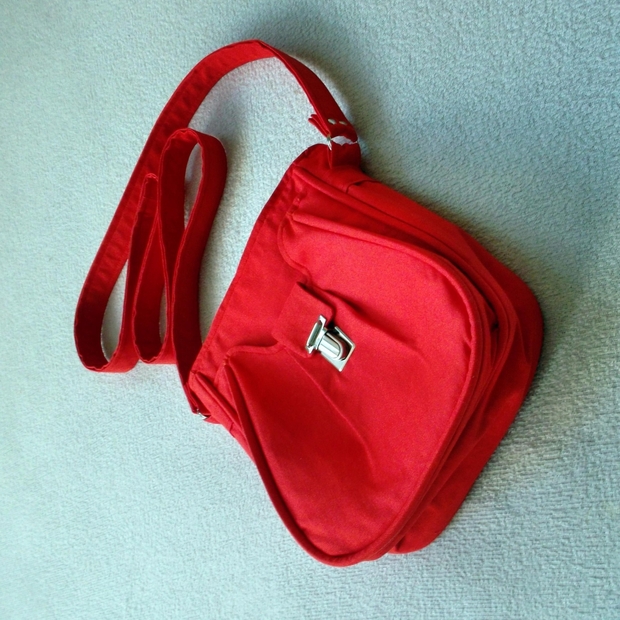 Menší oranžová kabelka, od které se vejde peněženka, klíče, kapesníčky,... a může se vyrazit:) Ušito dle Bellet design.