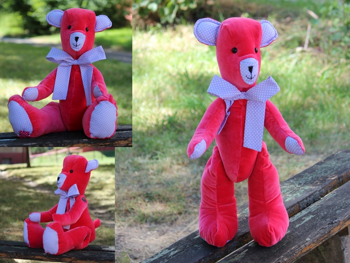 Plyšový medvěd, z růžového plyše a bavlněné látky. Ušito dle Bellet design.