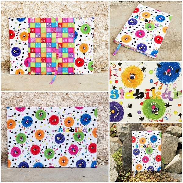 tuto látku jsem kupovala na začátku prázdnin s tím, že udělám klukům obaly do školy ... Nápis je vyšitý, chtěla jsem nejdříve udělat jednobarevné aplikace, ale bylo by škoda příšerky zastrčit do pozadí, tak je maskovaný mezi nimi ;)
