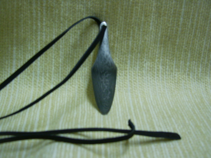 Damaškový přívěšek o 120 vrstvách na koženém řemínku. Délka 70 mm a šířka 20 mm