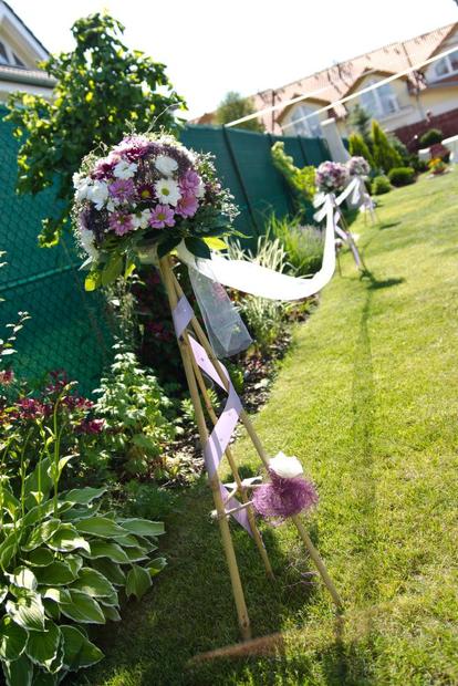 Výzdoba zahrady, stojany z bambusu s živými květinami