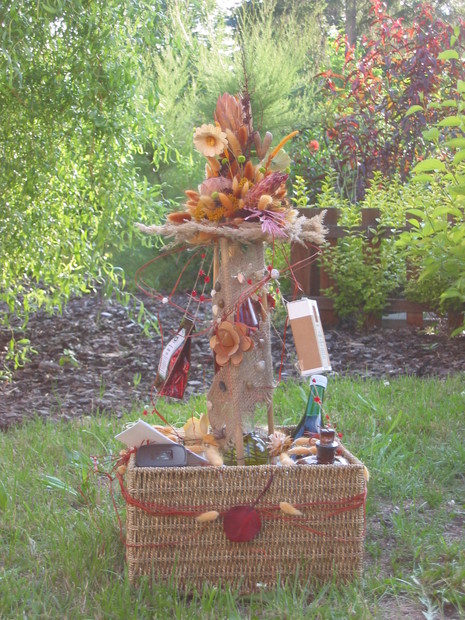 Uprostřed dárkového koše je zhotoven z bambusových tyčí komín, ve kterém jsou dvě láhve vína na sobě.Ten je nahoře zakončen dekorací ze suchých květin, která pak slouží jako ozdoba interiéru. Dárky jsou zavěšené na silonu v prostoru i ve spod koše.