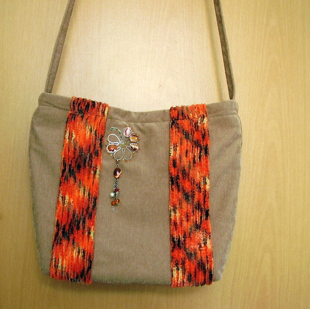 taška s patchworkovou žinílkou ušitá na objednávku pro kamarádku; aplikaci z tepaného drátu s korálky a polodrahokami stvořila Šklíbuška