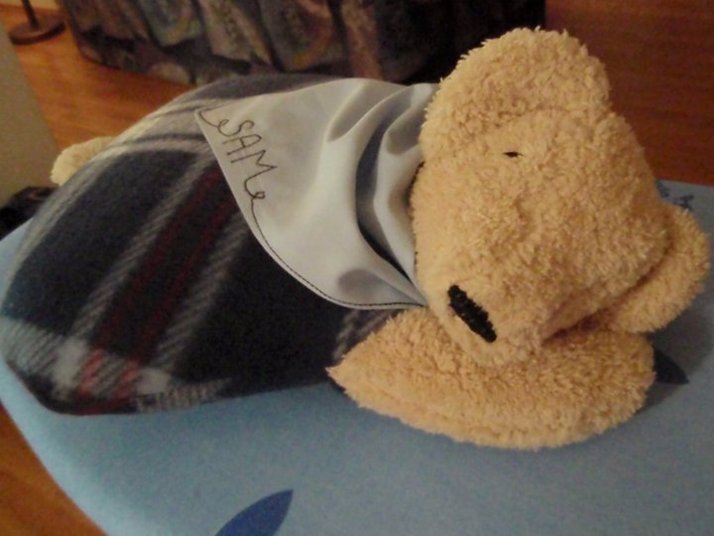Medvídek pro Sama s otáčecí hlavou jako polštářek.