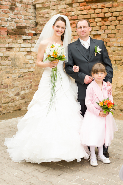 Kytice byla vázaná z orchidejí, oranžového ornithogalum, alstromerie bílé, fresie bílé a okrasný česnek.