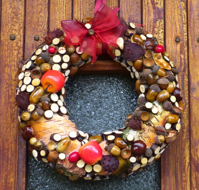 Podzimní věnec s žaludy a dřevěnnými špalíčky. Na zavěšení na dveře i jako dekorace bytu.
