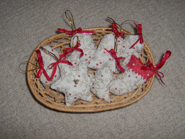 Vánoční ozdoby jsou šité z kvalitní metráže,plněné dutým vláknem, mají poutko a jsou dozdobeny barevnou pozlacenou nebo postříbřenou stuhou.