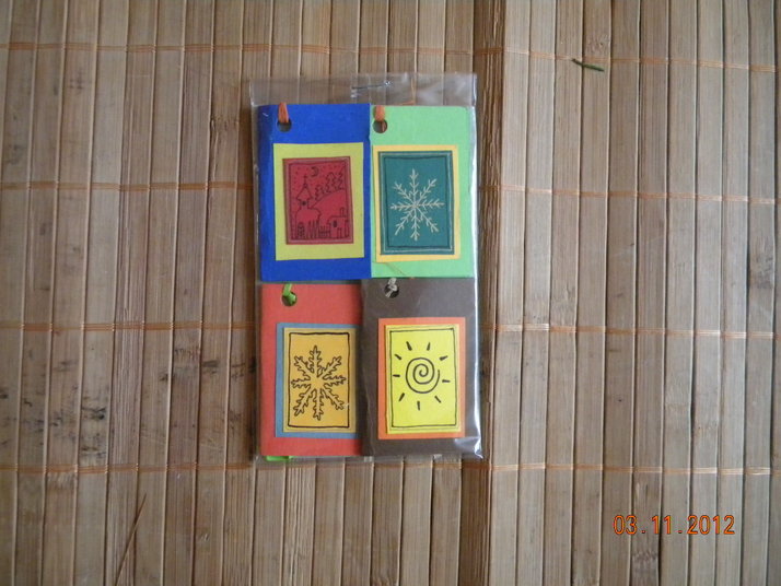 Jmenovky k dárkům jsou tvořeny z tvrdé,barevné čtvrtky.Malované tuší,černým fixem,gelovým perem.
