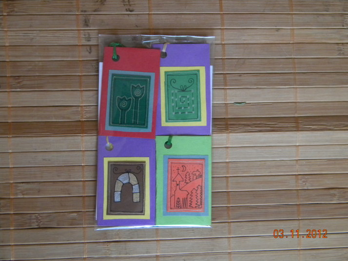 Jmenovky k dárkům jsou tvořeny z tvrdé,barevné čtvrtky.Malované tuší,černým fixem,gelovým perem.