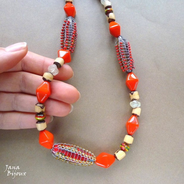 DLOUHÝ, MASIVNÍ A TAK TROCHU ETNO NÁHRDELNÍK ZE SKLA. TŘI VELKÉ KORÁLKY MAJÍ NAVÍC JEŠTĚ DRÁTOVÁNÍ S MINI ROKAJLEM, KAŽDÁ Z NICH MĚŘÍ 3,6 CM. DÁLE JSOU NA NÁHRDLENÍKU VYBROUŠENÉ VÁLEČKY ZE SEMÍNEK NA "ZTLUMENÍ" SVÍTIVÝCH BAREV SKLA. NÁHRDLENÍK JAKO TAKOVÝ MÁ 95 CM.