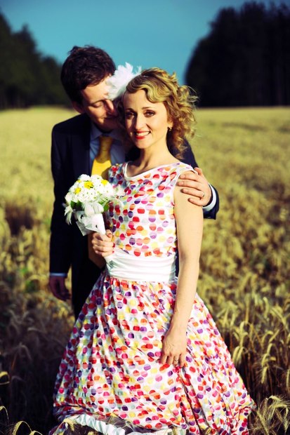 Netradiční svatební šaty z volánkové látky potištěné puntíky, tylová spodnička, velká obruč a saténový pásek.
