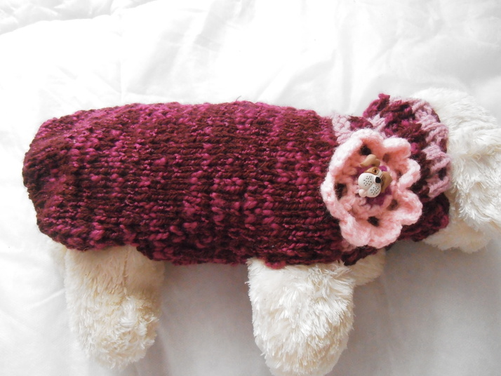 teplý psí svetřík,barvatmavá malina,na boku kvítečko se psím knoflíkem.délka 29cm.obvod bříška 35cm.