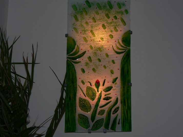 Nástěnné světlo, přední skleněná deska vytvořená technikou fusingu a malbou na sklo. Rozměry 56cmx26cm.