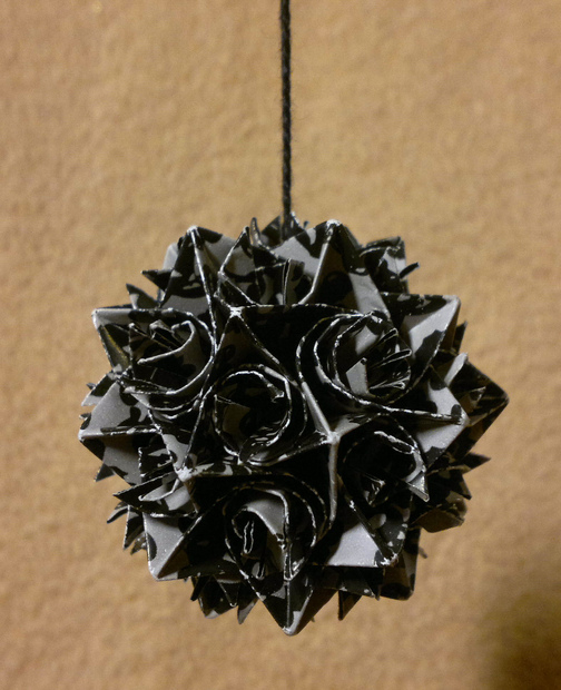 Papírová černá kulička o prúměru 4 cm na černé niti.