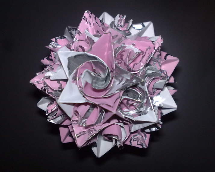 Kulička o prúměru 4 cm vyrobená z bílého a rúžového papíru se stříbrným žíháním.