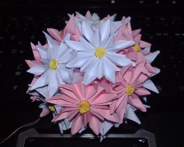 Květy jsou vyrobeny z poznámkového papíru 10 x 10 cm. Jednotlivé květy jsou k sobě přišity nití na zavěšení.