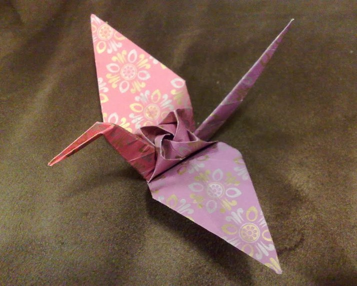 Jeřáb s rúží na zádech z origami papíru poskládaný podle Satoshi Kamiya