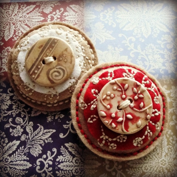 Brož z filcu s knoflíkem, vyšívaná bavlnkama