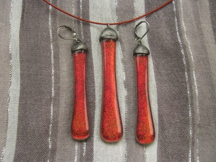 Skleněné šperky pro slavnostní příležitosti z dichroického skla v červeno zlatavém odstínu, vytvořené technikou fusingu a tiffany. Délka náušnic 6,5cm, délka přívěsku 7,5cm.