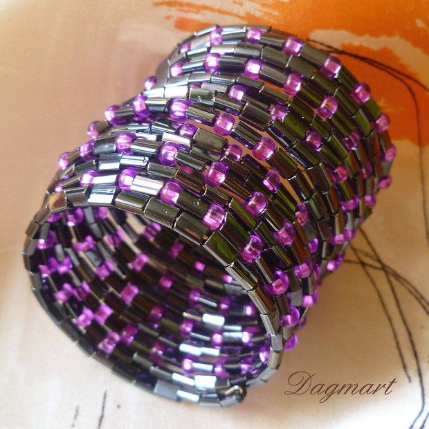 Výška náramku je 6 cm, 13 otoček. Použity jsou mačkané korálkya rokajl.