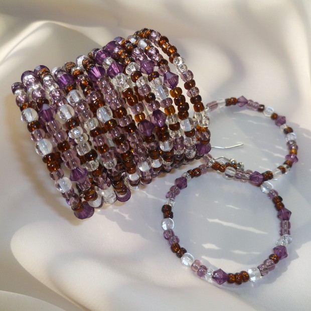 Použity jsou mačkané korálky, sluníčka a různé druhy rokajlu.