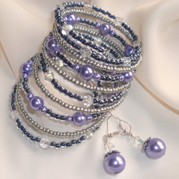 Použity jsou perličky, mačkané korálky a různé druhy rokajlu.