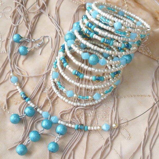 Použity jsou zvrásněné perličky, perličky,, mačkané korálky a různé druhy rokajlu.