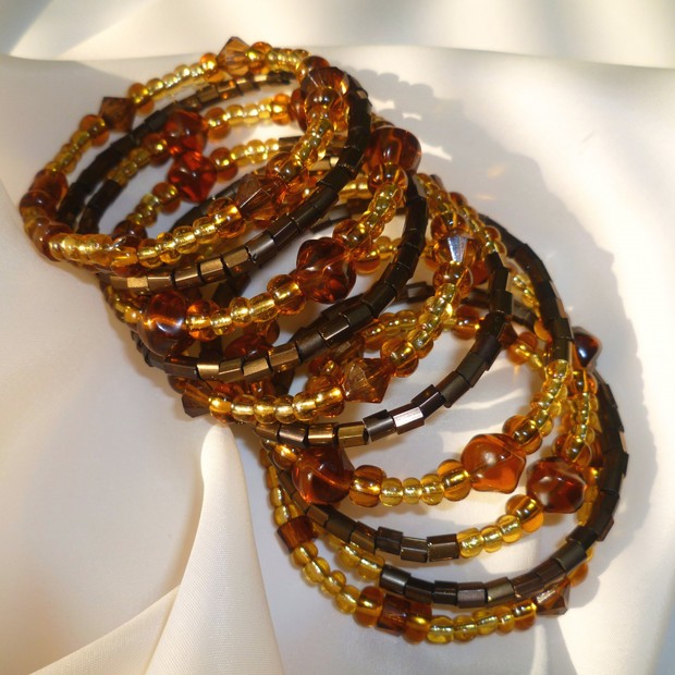 Použity jsou mačkané korálky a různé druhy rokajlu.